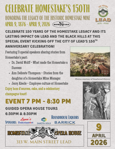 Honoring the legacy of the historic Homestake Mine and the official discovery of gold. April 9, 1876 - April 9, 2026 Celebrate 150 years of the Homestake Legacy and its lasting impact on Lead and the Black Hills at this special event kicking off the City of Lead’s 150th anniversary celebration! Featuring 3 special speakers sharing stories from Homestake’s past: -Dr. David Wolff - What made the Homestake a Success -Ann Delicate Thompson - Stories from the daughter of a Homestake Mine Manager -Jerry Aberle - Employee culture at Homestake Enjoy hors d’oeuvres, cake, and a celebratory champagne toast! Guided Opera House Tours will also be available at 6:30pm & 8:30pm!